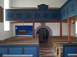 Der flachgedeckte Innenraum präsentiert sich heute ungewölbt. Die dreiseitig umlaufende, hölzerne Empore aus der Barockzeit ruht auf marmorierten Rundsäulen und dient an der Ostseite als Orgelempore. Da die Brüstungsmalereien von Hisgen in einem schlechten Zustand waren, wurden sie bei einer Innenrenovierung blau überstrichen. An der emporenlosen Südseite ist im Chor ein mehrtüriger hölzerner Pfarrstuhl mit durchbrochenem Akanthus-Rankenwerk eingebaut, der zum Kanzelaufgang führt. Die polygonale Kanzel stammt aus dem Barock. Vielleicht wurde sie zusammen mit den Emporen bei der großen Innenrenovierung im Jahr 1669 geschaffen.[9]