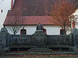 Auf der gegenüberliegenden Seite der Kirche wurde ein Denkmal für die Gefallenen des Ersten Weltkriegs errichtet. Im Jahr 1945 wurden die laubumkränzten Helme und der Adler abgenommen und neben dem Denkmal vergraben. Sie wurden 1995 bei der Sanierung freigelegt und wieder angebracht.