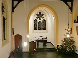 Die Kirche ist ein giebelständiger dreiachsiger Saalbau mit eingezogenem Rechteckchor. An der Südseite des Chores steht der Glockenturm, an der Nordseite ein Eingang mit Windfang.[5] Die Konzeption der Kirche entspricht in etwa den Empfehlungen des Eisenacher Regulativs. Abweichungen hiervon betreffen den Standort der Orgel und die durch die bauliche Umgebung bedingte Ausrichtung der Kirche.