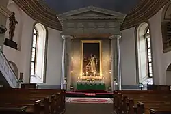 Im klassizistischen Altar befindet sich das Werk Christus auf dem Meer (1837) von Joseph Czauczik. Vom denselben Künstler stammen auch weitere Bilder in der Kirche (Martin Luther, mehrere Pfarrer, Mitglieder der Familie Horváth Stansith de Gradecz usw.). Aus der Artikularkirche wurden hierher mehrere Gegenstände übertragen, darunter 13 Bilder, die Kanzel aus dem späten 17. Jahrhundert, das Taufbecken aus dem Jahr 1714, ein Eisenkreuz und ein barockes Kreuz sowie die barocke Orgel aus dem Jahr 1697.[2] Weiter findet man im Inneren drei Emporen, eine davon beherbergt die Bibliothek sowie das Archiv des evangelischen Gymnasiums.[1]