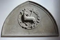 Im Innern der Kirche sind mehrere Relikte des Vorgängerbaus erhalten. Neben der historischen Grabplatte des Heinrich von Brettach († 1295) sind dies ein Bildstock von Hans Wunderer (um 1500, erneuert 1771) sowie das heute vermauerte Portaltympanon des Vorgängerbaus, das das Lamm Gottes als Reliefarbeit zeigt. Das Lamm wird von einem Eichenkranz umrahmt, und der Kopf trägt einen Heiligenschein. Das Lamm, Sinnbild für Unschuld und Opferbereitschaft, weist auf Christus hin, der die Sünden der Welt trägt (vgl. Johannes 1,29 und Jesaja 53,7).