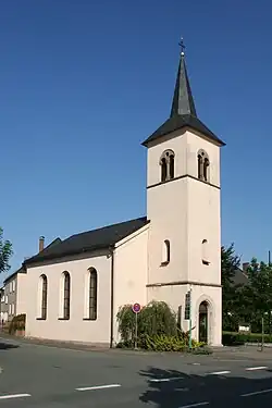 Die dreiachsige Saalkirche mit Drei-Sechstel-Schluss wurde von 1839 bis 1840 errichtet. Das Bruchsteinmauerwerk und die Holzbalkendecke sind verputzt, die Wände sind durch rundbogige Fenster gegliedert. Der Innenraum hat 110 Sitzplätze. Die Fensterbänke und der Fußboden wurden aus Schieferplatten hergestellt. Der Westturm wurde erst 1864 angebaut. Der Turm hat drei Glocken. Seit 1984 steht die Kirche unter Denkmalschutz.[9]