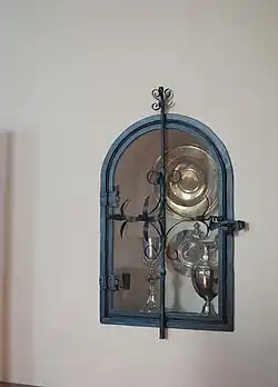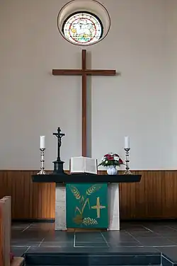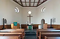 Bei der zweiten Renovierung 1989 wurde die Kirche 50 cm tief ausgeschachtet, um der immer noch vorhandenen Feuchtigkeit des Mauerwerks Herr zu werden. Es wurde eine Drainage verlegt und das Mauerwerk isoliert. Innen wurde der Altarraum vergrößert und die Stufe um den Altar entfernt. Es wurde eine elektrische Fußbodenheizung verlegt und der Bodenbelag in Schiefer ausgeführt.[7] Neben der Kanzel wurde eine Nische erstellt, in der der silberne Abendmahlskelch, die Patene und die dazu passende Abendmahlskanne sowie eine messingbronzierte Taufschale Platz finden. Das Gitter vor der Nische wurde von dem Kunstschmied Willi Schütte unter Verwendung der alten Kirchfirstspitze erstellt.[8] Der neue Innenanstrich der verputzten Flächen wurde in altrosa gehalten.[7]