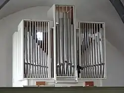 Im Jahr 1842 ist eine Orgelreparatur nachgewiesen. Im Zuge der Kirchenrenovierung baute Johann Georg Förster im Jahr 1899 als Opus 86 für 3075 Mark ein neues Werk mit neun Registern auf zwei Manualen und Pedal. Das Instrument hatte pneumatische Windladen und eine pneumatische Röhrentraktur.[13] Der Aufstellungsort war unterhalb der Nordempore. Die Orgel wurde 1992 durch ein Werk der Licher Firma Förster & Nicolaus Orgelbau ersetzt, das gebraucht von der Paul-Gerhard-Kirche in Offenbach am Main erworben wurde. Das Instrument wurde 1958 gebaut und wies ursprünglich sechs Register auf einem Manual und Pedal auf. Im Zuge der Umsetzung nach Muschenheim wurde auf einer leeren Schleife ein Salizional 8′ ergänzt. Die heutige Disposition lautet wie folgt: