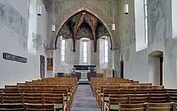 Das einschiffige Langhaus ist hell und mit einer flachen Decke versehen. Der Kirchenraum ist beidseitig des Mittelgangs mit einzelnen Holzstühlen ausgestattet. Von der Decke hängen an dünnen Kabeln zylinderförmige, weiße Leuchten, die den Blick auf die Freskenpartien aufgrund ihrer unauffälligen Gestaltung nicht ablenken sollen. Freskenfragmente finden sich sowohl an der Süd- wie auch an der älteren Nordwand. An der Nordwand in der Nähe zum Chor erinnert ein Epitaph an den Pfarrer Jeremias Gebhard († 27. Juni 1696). Zwischen Langhaus und Chor befindet sich ein durch Malereien geschmückter Triumphbogen. Der Bogen, der den Eingang zum himmlischen Jerusalem versinnbildlicht,[13] stellt über gemalten Quadersteinen (Diamantschnitt) das Gleichnis der klugen und törichten Jungfrauen dar. Sie sind als Halbfiguren zwischen Wolkenbändern gemalt; Engel halten das Schweißtuch der Veronika.