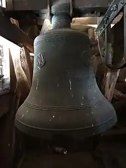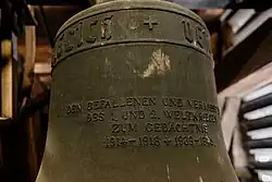 Vor dem Ersten Weltkrieg beherbergte der Dachreiter ein Dreiergeläut. Eine kleine mittelalterliche Glocke ohne Inschrift war zu dem Zeitpunkt gesprungen (Durchmesser 0,40 Meter). Die zweite Glocke hatte Johann Peter Bach aus Hungen 1791 gegossen (Durchmesser 0,63 Meter), die dritte Friedrich Otto aus Gießen 1838 (Durchmesser 0,71 Meter). Glocken 1 und 3 mussten 1917 an die Rüstungsindustrie abgeliefert werden. Als man 1922 drei neue Glocken anschaffte, wurde die zweite in Zahlung gegeben. Rincker und Sohn gossen drei neue Glocken. Die größte (Durchmesser 0,77 Meter) hatte die Inschrift „Ein feste Burg ist unser Gott“ und zeigt ein Relief mit Kruzifix und zwei Engeln. Die mittlere (Durchmesser 0,65 Meter) hatte die Inschrift „In schwerer Zeit unseren Gefallenen geweiht“ mit einem Relief des Eisernen Kreuzes in Lorbeer. Die dritte (Durchmesser 0,57 Meter) mit der Inschrift „Bete und arbeite“ hat die vier Evangelistensymbole.[15] Die beiden großen wurden nach dem Zweiten Weltkrieg 1950 durch zwei Glocken der Glockengießerei Grüninger ersetzt.