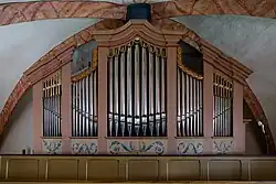 Johann Hartmann Bernhard baute im Jahr 1833 eine neue Orgel mit zehn Registern auf einem Manual und Pedal – gemäß Aufschrift am Spieltisch seine 33. Orgel. Der flache Prospekt ist in fünf Felder gegliedert und passt sich dem Gewölbe an. Im Jahr 1891 tauschte Johann Georg Förster die Quinte 3′ durch ein Salicional 8′ aus und baute ein neues Gebläse für insgesamt 506 Mark ein.[12] Ansonsten war die Orgel offensichtlich bis zum Jahr 2001 unverändert erhalten. Anlässlich der Renovierung der Kirche in den Jahren 2001/2002 wurde auch die Orgel ausgebaut. Im Rahmen des anschließenden Wiedereinbaus wurden offensichtlich von der ausführenden Werkstatt Änderungen vorgenommen:[13] Die Quinte 3′ wurde wiederhergestellt, allerdings als „Naßart“ und statt der Flöte 8′ findet sich seitdem ein Sifflet 1′ in der Orgel. Die aktuelle Disposition der Denkmalorgel lautet wie folgt:[14]