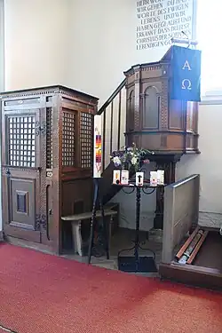 Die holzgeschnitzte, polygonale Kanzel vor dem südlichen Chorbogen ruht auf einem Wandpfeiler mit Volute, der auf einem viereckigen Steinsockel steht. Die Kanzelfelder haben Rundbogenfelder, die durch Pilaster gegliedert werden, die mit Intarsien verziert sind. Der obere, profilierte Gesimskranz hat einen Zahnschnittfries. Der polygonale Schalldeckel mit umlaufendem Zahnschnittfries ist profiliert und trägt als Inschrift den Psalmvers aus Ps 51,17 . Zwischen Kanzelkorb und Schalldeckel ist an der Südwand das Bibelwort aus Joh 6,68–69 zu lesen. Der Kanzelaufgang ist über den angeschlossenen Pfarrstuhl zugänglich. Er hat unten kassettierte Füllungen, oben durchbrochenes Gitterwerk. Die Lisenen weisen Schuppenmuster auf und der obere Gesimskranz einen Zahnschnittfries wie beim Schalldeckel.