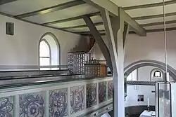Das Langhaus wird von einer Flachdecke mit Längsunterzug abgeschlossen, der von drei achteckigen Holzpfosten mit schlichten Kopfbändern gestützt wird. An der West- und Nordseite ist eine hölzerne, gestaffelte Winkelempore eingebaut, die an der Südwand nochmals abknickt. Sie ruht auf achteckigen Holzpfosten mit Kopfbändern, von denen einer mit der Jahreszahl 1600 bezeichnet ist.[3] Die Emporenbrüstung hat kassettierte Füllungen, die im Westen zwei Bibelworte und Füllung mit ornamentalen Ranken und Blumen und im Norden nur Ranken mit Blumen zeigen. Die barocken Malereien wurden bei einer Innenrenovierung im Jahr 1957 freigelegt.[1] Oben am Emporenaufgang erinnert eine Gedenktafel an die Soldaten aus Oberwalgern, Holzhausen, Stedebach und Etzelmühle, die in drei Kriegen des 19. Jahrhunderts (1814/1815, 1849, 1870/1871) gefallen sind. Die Schrifttafel zwischen zwei Pilastern mit Architrav wird von einem großen Oval mit einem gemalten Lorbeerkranz umschlossen.