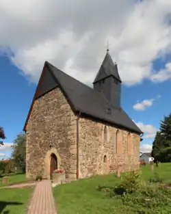 Die geostete Kirche ist aus unverputztem Bruchsteinmauerwerk aus Grauwacke mit Eckquaderung aus Sandstein im Norden des alten Dorfkerns errichtet. Sie steht inmitten eines umfriedeten Kirchhofs, dessen romanische Mauern noch teilweise erhalten sind.[5] Auf ihm stehen einige Grabsteine des 18. Jahrhunderts aus rotem Sandstein. Die Saalkirche hat eine halbrunde Apsis. Dem Satteldach sind an jeder Seite eine kleine Gaube und im Osten ein Dachreiter aufgesetzt. Portale und Fenster haben Gewände aus rotem Sandstein.