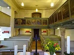 Der rechteckige Innenraum bietet seit der Süderweiterung mehr als 150 Menschen Platz. Er wird von einer kalkweißen, stuckierten Flachdecke von 1744 abgeschlossen. Ein Medaillon in der Mitte zeigt Mose am brennenden Dornbusch. In den vier Ecken wurden Rocaillen-Malereien im Stil des Rokoko freigelegt.[16]
