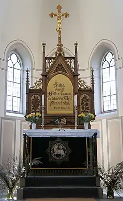 Der Altar ist von 1875 und hat folgende Aufschrift: „Siehe das ist Gottes Lamm, welches der Welt Sünde trägt.“ Dieser Bibelvers stammt aus dem Johannesevangelium, Kapitel 1, Vers 29.