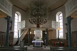 Ältester, mittelalterlicher Teil der Anlage ist der Kirchturm im Westen, der 1789 einen spätbarocken Haubenhelm erhielt. Das Langhaus ist als geräumiger Saalbau mit dreiseitigem Abschluss im Osten ausgeführt. Es besitzt ein relativ flaches Dach und neun rundbogig geschlossene Fenster. Die Ausstattung an der Altarseite mit Altar, Taufstein, Kanzel, Altarkreuz, Empore und Orgel entstammt der Bauzeit. Durch jeweils in der Mitte des Chores angeordneten Altar, Kanzel, Empore und Orgel erhält der Innenraum eine strenge, axiale Symmetrie.