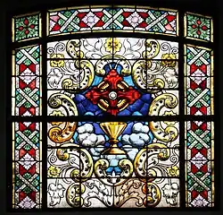 Der quergerichtete, hohe Saalbau mit Walmdach ist im Ortszentrum aus unverputztem Bruchsteinmauerwerk errichtet. Der Innenraum wird durch Fensterreihen in zwei Ebenen belichtet, die unten hochrechteckig mit flachen Stichbogen und oben als stehende Ovale gestaltet sind.[8] Die figürlichen Glasmalereien im Stil des Neobarock wurden 1896 von Henning und Andrés aus Hannover gefertigt.[1] Sie haben seitlich und im Stichbogen Ornamentbänder. Das Fenster über dem Westportal zeigt das Agnus Dei mit der Siegesfahne, das Fenster über dem Ostportal ein rotes Kreuz über einem Abendmahlskelch und die beiden hohen Südfenster je drei vierpassartige Rahmen, in deren Mitte Moses und Christus dargestellt sind.