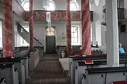 Die hölzerne Kirchenausstattung weist eine einheitlich graue Fassung auf, von der sich rot-weiß marmorierte Füllungen mit vergoldeten Profilen abheben. Im Inneren ruht die Flachdecke auf zwei Längsunterzügen, die von vier rot-weiß marmoriert bemalten Säulen gestützt werden. Die beiden westlichen Säulen wurden 1793 zur statischen Verstärkung eingebaut.[8] Die dreiseitig umlaufende graue Empore stammt wohl aus dem 19. Jahrhundert und wird von achteckigen Pfosten gestützt. Die Emporenbrüstung hat querrechteckige Füllungen, die ebenfalls rot-weiß marmoriert bemalt sind. In den beiden südlichen Ecken sind die Aufgänge eingebaut. Die Nordseite blieb ohne Empore, weil hier die Kanzel errichtet wurde.