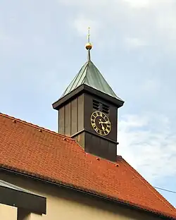 Das schlichte Langhaus mit Satteldach wirkt in Form und Höhe neben Wohnhäusern im Ort sehr unauffällig. An der Südfassade befindet sich ein ebenfalls mit einem Satteldach gedeckter Anbau, der neben dem Haupteingang auch die Sakristei beherbergt. An der Ostseite des Langhausdaches ragt ein kleiner Dachreiter hervor, der von einem mit einer Turmkugel bekrönten Pyramidendach bedeckt wird. An der Südseite des Dachreiters befindet sich das Zifferblatt der Kirchuhr. Außerdem ist an der Südwand ist eine Sonnenuhr angebracht.