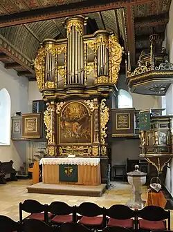 Ein Altarbild von 1678 zeigt die Darstellung des Jüngsten Gerichts. Der Taufstein wurde 1786 geschaffen.