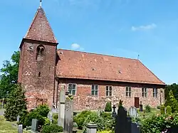 1743 wurde die Saalkirche in der Epoche des Barocks für die dortige reformierte Gemeinde gebaut. Das langgestreckte Kirchenschiff aus rotem Backstein unter einem hohen Satteldach ist aus dem Umbau der alten Kirche hervorgegangen. Sechs hochstehende Rechteckfenster gliedern die Seitenwände, zwei Fenster die gerade Ostwand. Im westlichen Teil haben vom Boden bis zu den Sohlbänken der Fenster die Backsteine das gleiche Format und den gleichen Verwitterungsgrad wie am Turm und bilden einen gleichartigen mittelalterlichen Mauerverband, sodass das Mauerwerk hier etwa ebenso alt wie der Turm sein dürfte. Im östlichen Teil sind die Backsteinformate ebenfalls mittelalterlich, weichen aber etwas von dem des Turms ab, und der Mauerwerksverband mit Lagen ganz aus Bindern ist typisch neuzeitlich. Anscheinend hat man hier neue Wände aus dem Material des Vorgängerbaus errichtet.