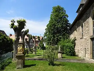 Rund um die Kirche befand sich der früher der Friedhof Weidenhausens. Erst seit der Zeit um 1829 liegt er außerhalb des Dorfes. Auf dem ehemaligen „Todtenhof“ vor der Kirche stehen noch einige beachtenswerte Grabsteine aus dem 18. und 19. Jahrhundert, die die Vergänglichkeit des menschlichen Daseins thematisieren. Umgeben wird der Platz von mehreren Linden, deren Baumkronen bis auf den Stamm zurückgeschnitten werden. Anlässlich der Neuregelung des Naturschutzes im Jahr 1935 sind die Bäume unter der laufenden Nummer 93 in das Naturdenkmalbuch des Kreises Eschwege eingetragen worden und erhielten mit dem Inkrafttreten der Verordnung zur Sicherung von Naturdenkmalen in den Stadt- und Landkreisen des Regierungsbezirks Kassel am 1. November 1936 den Schutz des Reichsnaturschutzgesetzes.[5] In der Liste der Naturdenkmale des Werra-Meißner-Kreises haben die Linden die Nummer ND 636.593 und werden als „rechtsverbindlich festgesetzte Einzelschöpfung der Natur“ durch das Bundesnaturschutzgesetz besonders geschützt.[6] Mit der gleichen Verordnung ist auch die Linde auf dem Anger vor Kirche zum Naturdenkmal erklärt worden.
