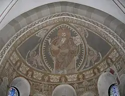 Die kleine, zweijochige Hallenkirche steht auf einem fast quadratischen Grundriss. Der Chor mit Apsis ist rechteckig, der Westturm quadratisch. Das Gebäude stammt aus der Mitte des 13. Jahrhunderts. Es wurde erstmals 1316 im Liber valoris (Zinsbuch des Erzbistums Köln) erwähnt. Das Raumbild ist kapellenhaft gedrungen. Schwere Rundpfeiler tragen die kuppelartigen Kreuzgratgewölbe im Chor und im Mittelschiff. Die Seitenschiffe, die in kleinen Wandapsiden enden, sind mit Gratgewölben gewölbt. Die Verlängerung der Seitenschiffe und die Verbindungsöffnung zur angrenzenden Turmhalle stammen aus dem 20. Jahrhundert. Bei Renovierungen im Jahr 1914 wurden Wand- und Deckenmalereien in der Apsis freigelegt. Sie wurden wegen des schlechten Zustandes des Putzes nicht restauriert, sondern neu ausgemalt.[1] Ungewöhnlich (insbesondere für westfälische Kirchen) ist hier die synoptische symbolhafte Darstellung der beiden Städte Rom und Konstantinopel (s. Abb.) In der Gemeinde gab dies zu Spekulationen Anlass, dass dieses Fresko daher möglicherweise zu Zeiten des vierten Kreuzzuges (1202–1204) und der hier im Zusammenhang vorgenommenen Errichtung des Lateinischen Kaiserreichs nebst lateinischen Patriarchen (1204 bis 1261) entstanden sein könnte, als das Morgenländische Schisma des Jahres 1054 vorübergehend gegenstandslos wurde, weil in diesem Zeitraum auch Konstantinopel wieder mit der Gesamtheit des römisch-katholischen Glaubens assoziiert war.