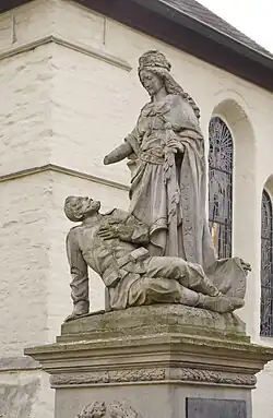 Vor der Kirche stehen ein Kriegerdenkmal und ein Trinkbrunnen.