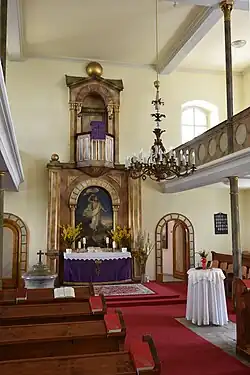 Der Kanzelaltar zeigt das Altarbild Auferstehung Christi gemalt von J. Rohrer (1868). Der Taufstein zeigt die Jahresangabe 1869.