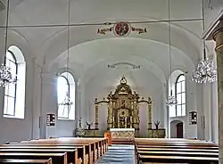 Der Kanzelaltar stammt aus dem frühen 19. Jahrhundert, wie auch der achteckige Taufstein, dessen neobarocker Deckel eine Taufgruppe trägt. Die Orgel ist von 1860.