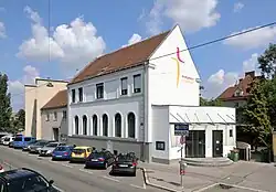 - ↑ Evangelische Pfarre Floridsdorf (Seite nicht mehr abrufbar, festgestellt im April 2018. Suche in Webarchiven) Info: Der Link wurde automatisch als defekt markiert. Bitte prüfe den Link gemäß Anleitung und entferne dann diesen Hinweis. Projektseite zum Kirchenzubau Eingangsbereich 2002 mit Plänen