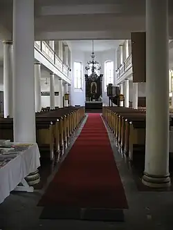 Bei der grundlegenden Renovierung 1881 wurde das Gotteshaus teilweise neoklassizistisch verändert. Das Gebäude erhielt eine Apsis, und die Inneneinrichtung wurde in ihrem bis heute nahezu vollständig erhaltenen Bestand ergänzt bzw. verändert.[2] Im Innenraum sind Emporen eingezogen, die auf toskanischen Säulen ruhen.[3] Altar und Kanzel sind im Stil des Schinkelzeit gestaltet.