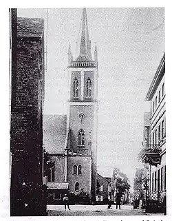 Der reformierte Gottesdienst musste um 10 Uhr beendet sein, damit die Katholiken den Kirchenbau verwenden konnten. Damit war das Simultaneum in der ehemals reformierten Kirchen eingeführt. Der evangel. Kirchengemeinde stand das Kirchenschiff, der katholischen Kirchengemeinde der Chorraum mit dem barocken Hochaltar zur Verfügung.[6] Im Jahre 1777 wurde die Kirche umgebaut, wobei das Kirchenschiff und der Turm erneuert wurden. Das 1777 entstandene Kirchenschiff bestand aus einem saalartigen Raum mit drei Fensterachsen, wobei sich der Haupteingang in der dritten Fensterachse auf der Seite zum Marktplatz hin befand. Fenster und Türen hatten Rundbogenabschlüsse. Auf der Westseite erhob sich ein viereckiger, keilförmiger Kirchturm aus Bruchsteinen.[7] 1868 wurde nach Entwürfen des Bauinspektors Conradi der keilförmige Kirchturm abgebrochen, während das Kirchenschiff aus dem Jahre 1777 um zwei Fensterachsen nach der Hauptstraße hin erweitert wurde. Direkt an der Straße wurde der neue Kirchturm mit Eingang im Stil der Neogotik erbaut. Die Rundbogenabschlüsse der Fenster erhielten neo-gotische Spitzbogenabschlüsse. Der Bau wurde am 15. November 1868 eingeweiht.[8]
