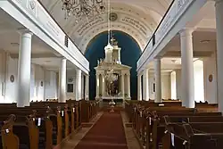Das vierjochige Langhaus hat eine Flachdecke und Pilaster. Die an drei Seiten umlaufende Empore steht auf toskanischen Säulen.