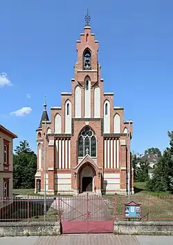 Der neugotische Backsteinbau mit originaler Einrichtung wurde im Jahre 1862 nach den Plänen des Architekten Hans Petschnig errichtet. Von 1911 bis 1912 wurde der Altarraum abgemauert und die Kanzel versetzt. Der hohe weite Saalbau unter einem Satteldach mit niedrigem Chor wird westlich und östlich von einem Treppen-Glocken-Giebel überragt. Das Spitzbogenportal mit Vorhalle zeigt im Tympanon ein Relief Lamm Gottes. Das Innere ist ein schlichter steinsichtiger Raum mit offener hölzerner Dachkonstruktion über Blendarkaden und Reliefkonsole. Die Orgelempore über Rundstützen ist aus Holz. Die Orgel aus dem Jahre 1862 ist von Carl Hesse. Die einheitlich neugotische Einrichtung umfasst die Kirchenbänke, Opferstöcke, die Kanzel mit Brüstungsreliefs der vier Evangelisten und ein Taufbecken aus Marmor mit Messingaufsatz.