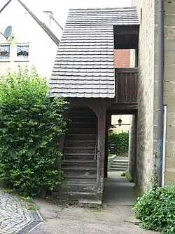Die Achse der Kirche, etwa der des benachbarten Schlosses parallel, folgt dem Fallen des Hügels und ist nach Nordosten ausgerichtet, mit einer überdachten hölzernen Doppel-Emporentreppe von 1750 an der südwestlichen Bergseite und der Apsis im Erdgeschoss des unten viereckigen, darüber achteckigen Chorturms mit Kuppeldach im Nordosten. Südöstlich an den Turm schließt die Sakristei an, in der auch der Turmaufgang beginnt. Unfern der Apsis steht außen an der Kirchenmauer im Nordwesten ein niedriges Türmchen mit polygonalem Grundriss und Helm, über das früher eine weitere Empore im Vorderteil der Kirche zugänglich war; diese ist heute nicht mehr vorhanden und der Aufgang ist deshalb ebenso funktionslos wie die äußere Emporentreppe, weil inzwischen auch innen eine Treppe den Aufstieg zu dieser erlaubt. Zwei Eingänge liegen achsensymmetrisch gegenüber seitlich vorn am Schiff an der Nordwest- und Südostseite, zwei andere im hinteren Teil auf der Achse des Schiffs übereinander auf Emporenhöhe sowie – außen ebenerdig – darunter. Die Stiftertafel ist über dem Nordwesteingang angebracht.