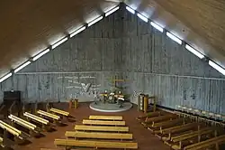 Die Kirche ist als liturgischer Raum mit Trennung von sakralem und Gemeindebereich konzipiert. In dem fünfeckigen Raum erfolgte die Ausrichtung auf den Altar in einer der Ecken, sie wird außerdem durch den Verlauf der Raumkanten, die Anordnung der Sitzbänke und das Gegenüber der Orgelempore betont. Es wurden Sichtbeton und naturbelassene Materialien verwendet. Zwischen Dach und Betonwand befinden sich waagerechte Lichtbänder. Senkrechte Fensterbänder rhythmisieren die Fassade an drei Seiten, die den Altar flankierenden Wände sind im Sakralraumbereich fensterlos, doch im rückwärtigen Untergeschoss durchgehend befenstert. Unter dem Kirchenraum sind der Gemeindesaal und weitere Räume in den fünfeckigen Grundriss eingepasst.
