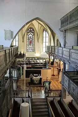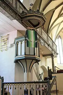 Die polygonale hölzerne Kanzel ist am nördlichen Chorbogen aufgestellt. Der Kanzelkorb ist im Stil der Neugotik mit Nonnenköpfen in den Kanzelfeldern gestaltet und ruht auf einem achtseitigen Pfosten. Der Schalldeckel geht auf das 17. Jahrhundert zurück und wird von durchbrochenem Schnitzwerk bekrönt. Das Kirchengestühl und das Chorgitter wurden im frühen 19. Jahrhundert geschaffen.[1]