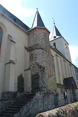 Der unverputzte Treppenturm am Chor stammt aus dem Jahr 1902 und hat einen achtseitigen Spitzhelm. Auch der unverputzte Vorbau an der Nordseite stammt aus dieser Zeit.[3] Die beiden Anbauten im Stil des Historismus heben sich von den verputzten älteren Baukörpern ab.