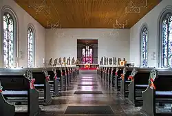 Der eingezogene Chor im Südwesten hat Ecklisenen mit einem Rundbogenfries. Die rechteckige Eingangstür zum Gemeinderaum hat ein schlichtes Vordach, über dem ein Rundbogenfenster eingelassen ist. Ein dreibahniges Rundbogenfenster in einer Rundbogenblende belichtet den Chorraum. Die Fenster haben Buntglas, das aus Dreiecken zusammengesetzt ist. Die Fensterscheiben der Langseiten werden von Grautönen beherrscht, während sich der Chorbereich in warmen Rottönen abhebt und die Aufmerksamkeit des Gottesdienstbesuchers auf Wort und Sakrament lenkt.