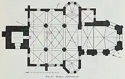 Das Hallenlanghaus auf annähernd quadratischem Grundriss hat drei Schiffe mit je drei Jochen, die auf vier Mittelsäulen ruhen, und tendiert dadurch zu einem Zentralbau. Allerdings sind die östlichen beiden Jochen der Seitenschiffe anders ausgebildet. An ein schmales rechteckiges Joch kragen nach Norden und Süden Dreiachtelschlüsse aus, sodass der Eindruck einer Hallenkirche mit kreuzförmigem Grundriss entsteht.[16] Durch die Querhausarme, die wohl an den Vorgängerbau erinnern, entsteht eine Dreikonchenanlage.[3] Im Inneren liegen die östlichen Joche der Seitenschiffe etwa 1,50 Meter tiefer als die übrigen Joche. Das Mittelschiff ist gegenüber den Seitenschiffen breiter und leicht überhöht.