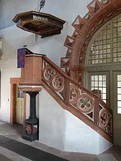 Die sechseckige steinerne Kanzel von 1606 auf der Mittelachse des Schiffes hat einen hölzernen, polygonalen Schalldeckel, auf den der Bibelvers aus Mt 24,35 gemalt ist: „Himmel und Erde werden vergehen, aber meine Worte vergehen nicht“. Stilistisch steht sie am Übergang von der Gotik zur Renaissance. Die steinerne Brüstung des Kanzelaufgangs weist als Maßwerk Kreise mit Vierpässen auf. Der Altartisch aus weiß-geädertem schwarzem Marmor auf geschweiftem Fuß wurde um 1830 geschaffen. Die dreiseitige Empore wurde 1874 in ähnlicher Konstruktion wie die alte Empore eingebaut.[27] Sie ruht auf toskanischen Steinsäulen, die oben in viereckige, die Unterzüge stützende Holzpfosten übergehen. Das neugotische Gestühl des Fürstenstuhls stammt ebenfalls von dieser Innenrenovierung.[22] Das hölzerne Epitaph für Graf Moritz fand an der Ostwand des Kirchenschiffs neben der Tür zur Sakristei Platz. Zwei Kronleuchter stammen aus dem 19. Jahrhundert und unterstreichen die axiale Ausrichtung des Schiffs. Der tschechische Maler Jiri Vlach schuf das abstrakte zeitgenössische Ölgemälde an der Südwand mit dem Titel Christusoffenbarung. Das Geschenk der örtlichen katholischen Gemeinde ist das einzige Gemälde in der reformierten Predigtkirche.[25]