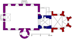 Der spätgotische Chor mit unregelmäßigem 3/8-Schluss ist mit einem neugotischen Rippengewölbe gedeckt, das seit 1907 eine flache Holzschalung ersetzt. Die Strebepfeiler aus der Erbauungszeit weisen darauf hin, dass der Chor ursprünglich über ein Gewölbe verfügte. Die großen, zweigeteilten Spitzbogenfenster sind alt, das Maßwerk mit Fischblasen und Rundbögen ist teilweise erneuert. Von der ursprünglichen halbrunden Apsis ist an alter Stelle der mit Blättern verzierte Knauf erhalten, in dem das Kegeldach einst endete.[21]