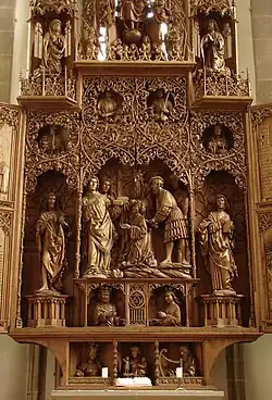 Besonderes Schmuckstück der Kirche ist der aus Lindenholz geschnitzte Hochaltar im Chor, einer der größten und künstlerisch bedeutendsten Schnitzaltäre dieser Art. Er wurde zwischen 1520 und 1529 aufgestellt und hat eine Höhe von rund 13 Metern, seine Breite beträgt bei geschlossenen Flügeltüren vier Meter, bei geöffneten Türen 7 Meter. Er zeigt bereits deutliche Stilelemente der Renaissance, wird jedoch insgesamt noch der Spätgotik zugeordnet. Auf Grund von Stilvergleichen schreibt man ihn dem Künstler Christoph von Urach und seiner Werkstatt zu.