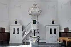 An der Ostseite finden sich zwei Holzemporen und an der Westseite ein zweiteiliger, kunstvoll geschnitzter Kanzelaltar.