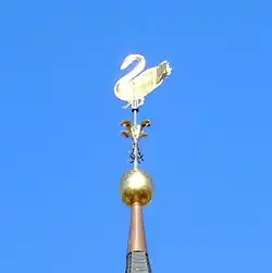 Vermutlich auf Vermittlung von Wilhelm Hellwig, der auch Baumeister der Monschauer Kirche war, kaufte die Monschauer Gemeinde das Balkenwerk der barocken Turmhaube mit „Stange, Knopf und Schwan“ der lutherischen Gemeinde in Mülheim ab.[35] Nachdem zunächst die Lieferung für die Wochen nach Pfingsten vertraglich vereinbart gewesen war, erfolgten die Anlieferung und der Aufbau schließlich einige Wochen nach Eröffnung der Kirche im Oktober 1789.[36] Die Haube mit dem Schwan ist also rund 100 Jahre älter als das übrige Bauwerk.