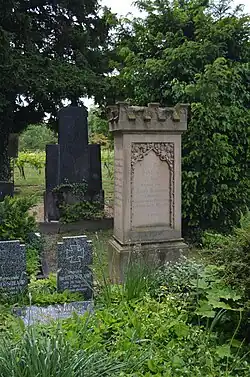 Anna Maria Schlamp | Grabmal Anna Maria Schlamp († 1873): zinnenbekrönte gotisierende Stele |