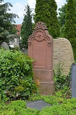 Adam Sander III | Grabmal Familie Sander, u. a. Adam Sander III († 1899): neuklassizistische Schauwand mit toskanischer Säulenädikula, Sandsteineinfassung |