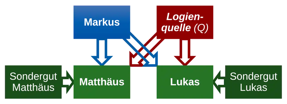Die Zweiquellentheorie wird von historisch-kritischen Exegeten fast konsensual für die Vorgeschichte des Matthäusevangeliums genutzt:[34]
