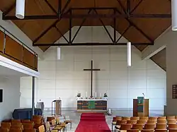 In den 1950er Jahren ist das Rechteck der vorherrschende Grundriss im Kirchenbau, das das Prinzip der traditionellen Wegekirche im Sinne des Eisenacher Regulativs verkörpert, bei dem der Chor der Kirche gegen Sonnenaufgang liegt. Neben dem traditionellen Grundriss wurde vielfach auch eine konventionelle Konstruktionsweise gewählt. Charakteristisch für Streckebachs Bauten ist die asymmetrische Anordnung der von Stützen aus Stahl getragenen Empore auf nur einer Seite des Langhauses. Die mit einem Satteldach gedeckte Saalkirche ist ein Stahlbetonskelettbau mit zwei Anbauten, der nach Süden für die Sakristei und der nach Norden für das Taufbecken. Die Sparren des Dachstuhls sind innen sichtbar. Über den Kehlbalken befindet sich eine Flachdecke. Die Wände sind über einem Sockel aus roten Ziegeln sandfarben verputzt. An den Längswänden reichen die in Sichtbeton gerahmten Fenster bis fast zur Dachtraufe.