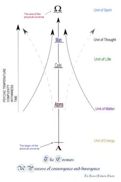 Weitreichende philosophische Überlegungen zu einer universellen Evolution stellte der Jesuitenpater Pierre Teilhard de Chardin in der ersten Hälfte des 20. Jahrhunderts an. Als Vertreter der christlichen Religion gehört sein Entwurf zum Theistischen Naturalismus, da er Gott – von ihm als Punkt Omega bezeichnet – als erste Ursache und Triebfeder der Evolution sah und damit auch eine gezielte Höherentwicklung begründet. Darüber hinaus war für ihn alles einer sprunghaften Evolution unterworfen, die auf materieller Ebene zu einer Zunahme an Komplexität und auf geistiger Seite an „Zentriertheit“ führen würde.[95]