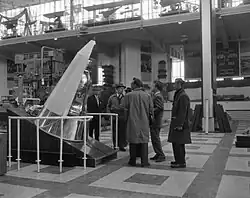 Im Inneren ihres Pavillons zeigte die Sowjetunion auf zwei Ebenen Ausstellungen, die den hohen Entwicklungsstand der sowjetischen Gesellschaft belegen sollten. Mit Exponaten zu Wissenschaft und Technik, beispielsweise dem zivilen Düsenjet Tupolew Tu-104 und Modellen der Raumfahrttechnik, die sich als absoluter Publikumsmagnet erwiesen, stellte die Sowjetunion ihre 40-jährige Erfolgsgeschichte dar.[34] Die repräsentative Limousine GAZ-13 Tschaika wurde hier erstmals der Öffentlichkeit gezeigt.[35] Zahlreiche Objekte zur Schwerindustrie und zur Landwirtschaft rundeten die Schau ab. Insbesondere mit ihren vielfältigen kulturellen Aktivitäten, den Konzerten, Ballettaufführungen und Kunstausstellungen, erlangte die Sowjetunion ein hohes Maß an internationaler Anerkennung.