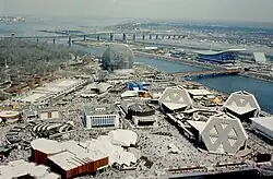 Die Expo 67 fand auf der Halbinsel Cité du Havre, früher als Mackay Pier bezeichnet, und den im Sankt-Lorenz-Strom gelegenen Inseln Sainte-Hélène und Notre-Dame statt. Das 365 Hektar große Gelände befindet sich in der Nähe des Montrealer Hafens und der Altstadt, womit es zentral gelegen ist. Beide Inseln sind sowohl untereinander als auch mit beiden Uferteilen Montreals über Brücken verbunden. Vom Parc de la Cité du Havre führt die Pont de la Concorde (engl.: Concordia Bridge) zur Südspitze der Île Sainte-Hélène, die am 21. Oktober 1965 eingeweiht[31] wurde. Die 690 Meter lange Balkenbrücke ermöglichte der Expo 67 den schnellsten Zugang zum Haupteingang am Place d’accueil. Am östlichen Ufer der Insel ändert die Brücke ihre Richtung um rund 30 Grad in südöstliche Richtung und verbindet als Pont des Îles damit auch die zweite Insel Notre-Dame.